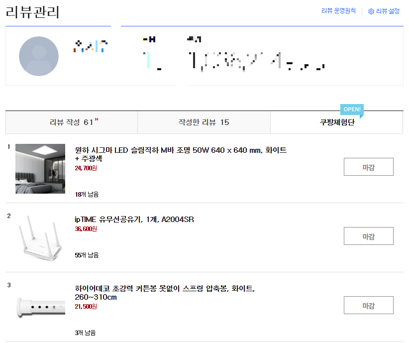 쿠팡체험단 물품 확인은 마이쿠팡 -> MY활동(리뷰관리) -> 쿠팡체험단에 있습니다.